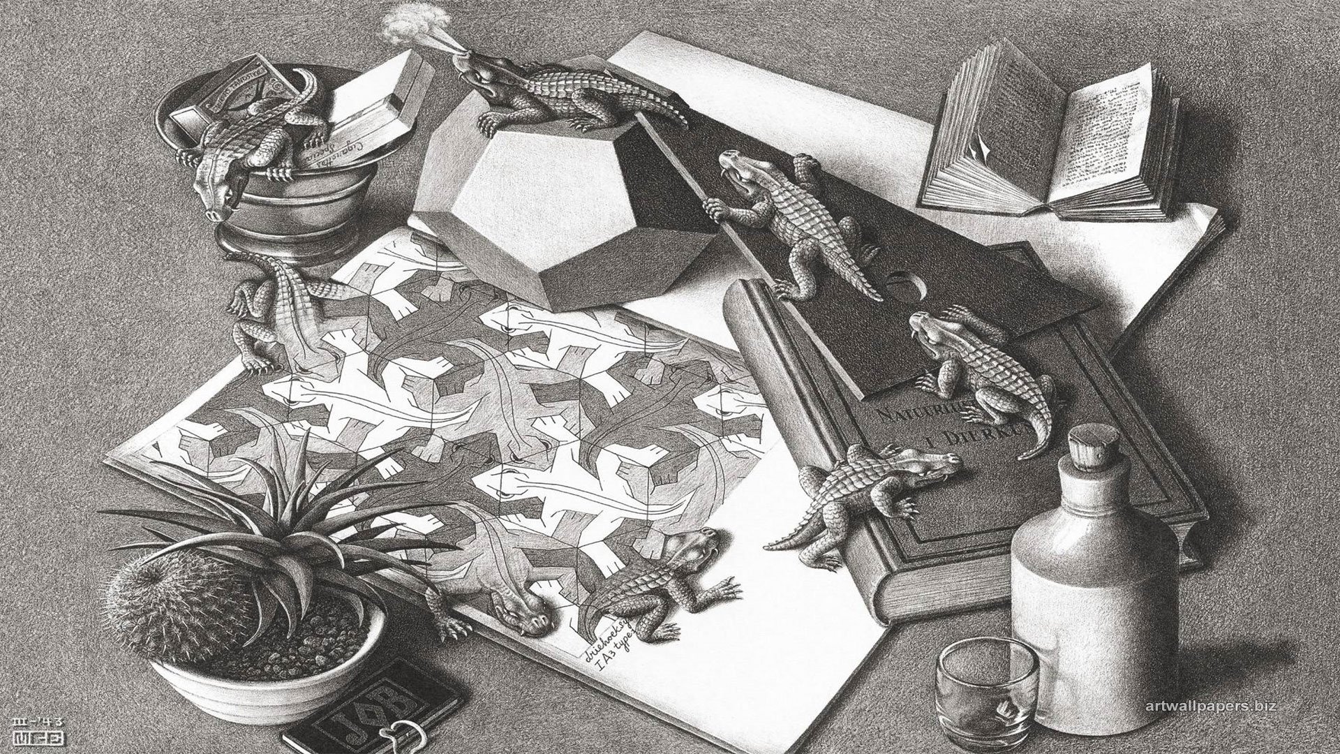 Gelesen, so wie es M.C. Escher oben in seiner Skizze zeigt. Buchstaben, Symbolen gleich, kriechen aus den Blättern, werden lebendig, spazieren herum.